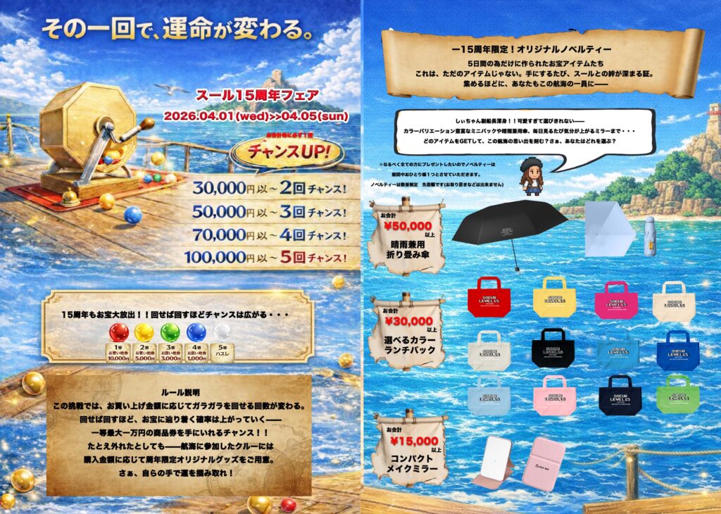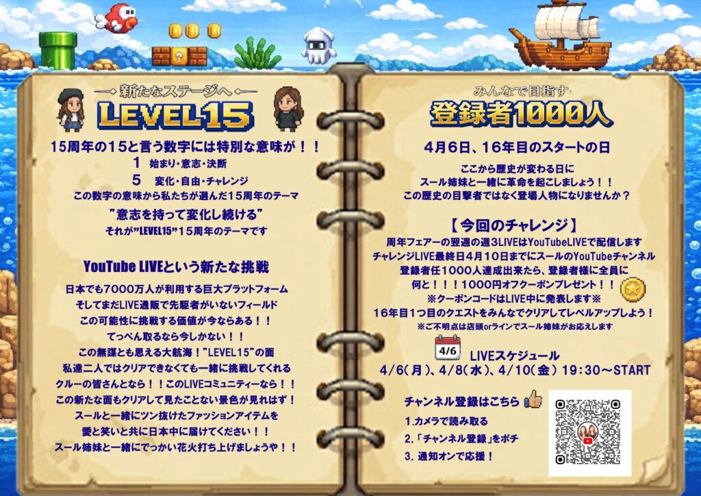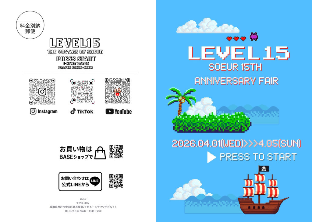 15周年のテーマはLEVEL15~16年目は次のステージへ駆け上ろうという事で周年フェアー終了の翌日16年目のスタートの日に